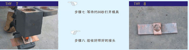 注意事项 1、首先根据连接件形状尺寸,开具合适的模具,并配置相应型号的焊粉 2、焊接前对拉件进行处理,除油、除污物及氧化层 3、对模具进行充分强热 4、安装好模具检查后倒入焊粉并点燃反应 5、对模具进行清理并准备下次使用